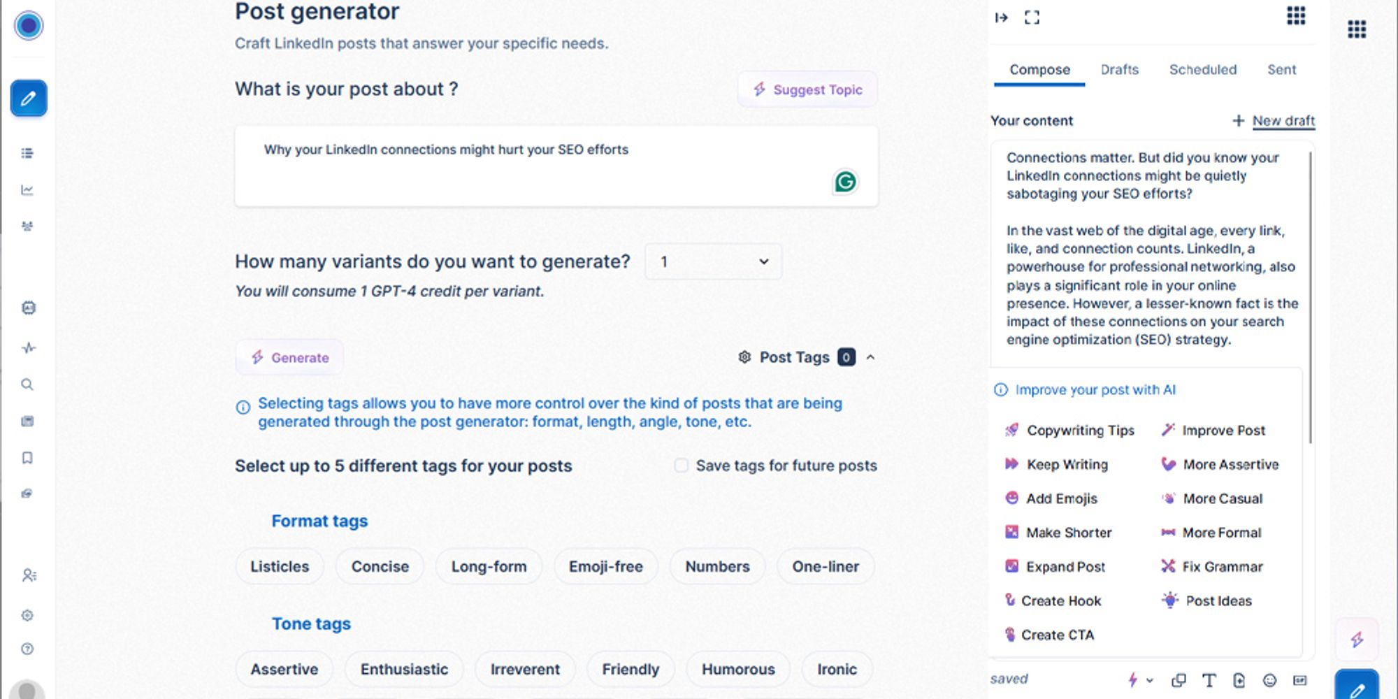 With MagicPost, you can maintain a steady stream of LinkedIn content through its AI-powered features. It makes content creation easy by suggesting post ideas, generating drafts, and editing and personalizing the content to fit your brand voice.
