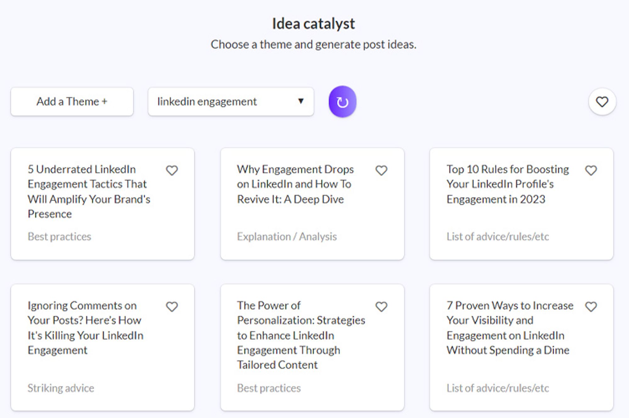 To ensure you always have new content to post on LinkedIn, MagicPost has an Idea generator. Type your subject and select the categories that best match your brand voice.