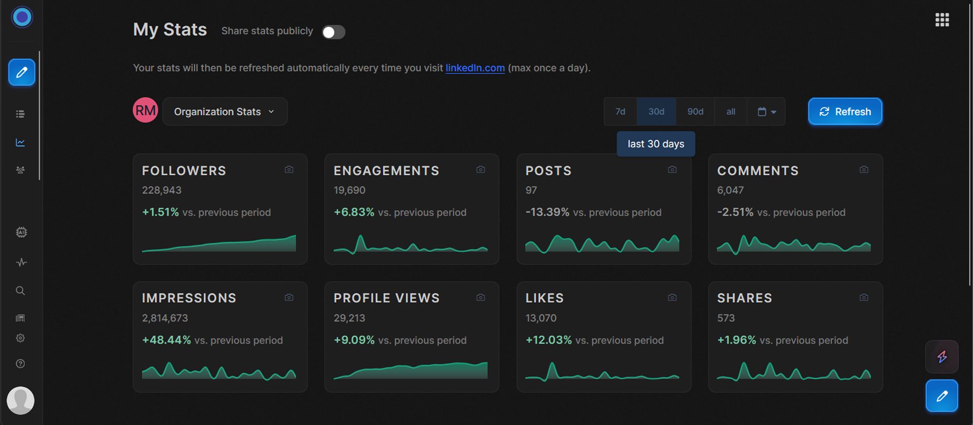 Taplio helps you improve your content strategy by providing insights into your post performance. It tracks your profile number of followers, engagements, profile views, impressions, and more.