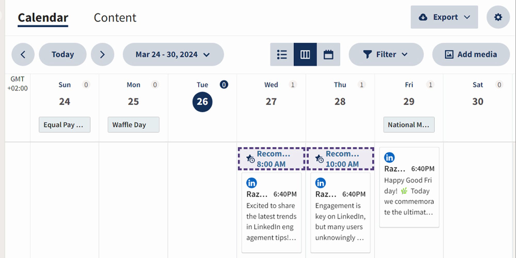 Both tools allow you to manage your content calendar efficiently. Hootsuite stands out through its bulk scheduling tool. However, you can’t set the exact publishing order, and Hootsuite doesn’t inform you about any scheduling errors.
