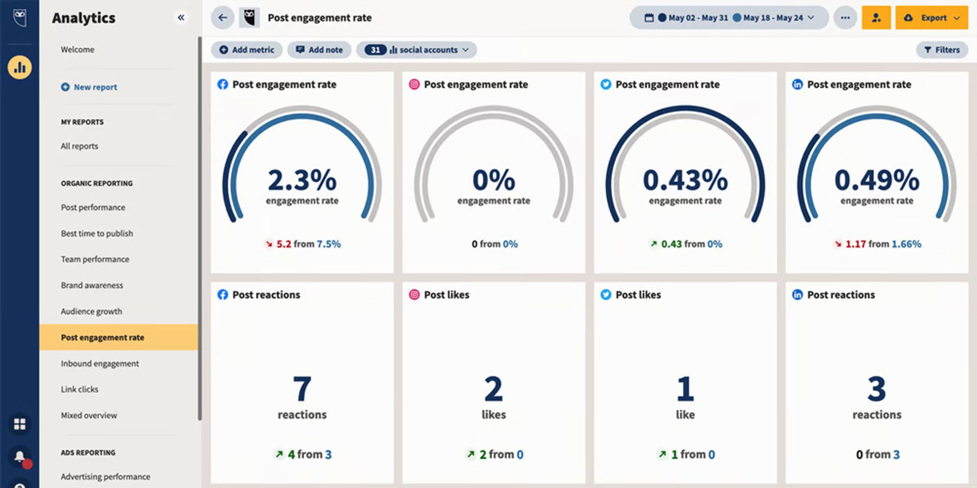 Hootsuite makes it easy to analyze your post’s performance across multiple platforms. You can customize the reports and determine if you have the winning strategy by comparing your performances with your competition.