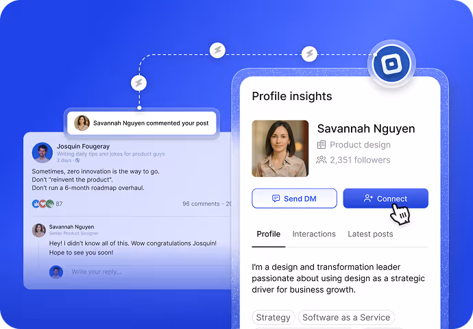 Taplio shows you who liked and commented on your posts. From there, you can click on any profile and open the side panel to send a connection request or DM instantly.