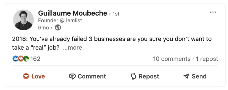 - Ask a challenging question: “2018: You’ve already failed 3 businesses are you sure you don’t want to take a “real” job?” (source: Guillaume Moubèche)
