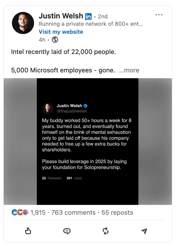 - State a surprising fact: “Intel recently laid of 22,000 people.” (source: Justin Welsh)
