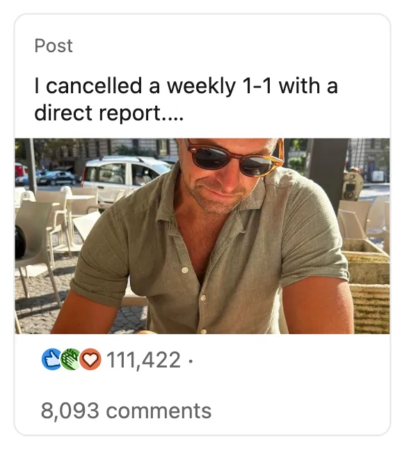 - Create intrigue: “I cancelled a weekly 1-1 with a direct report.” (source: Tom Hunt)