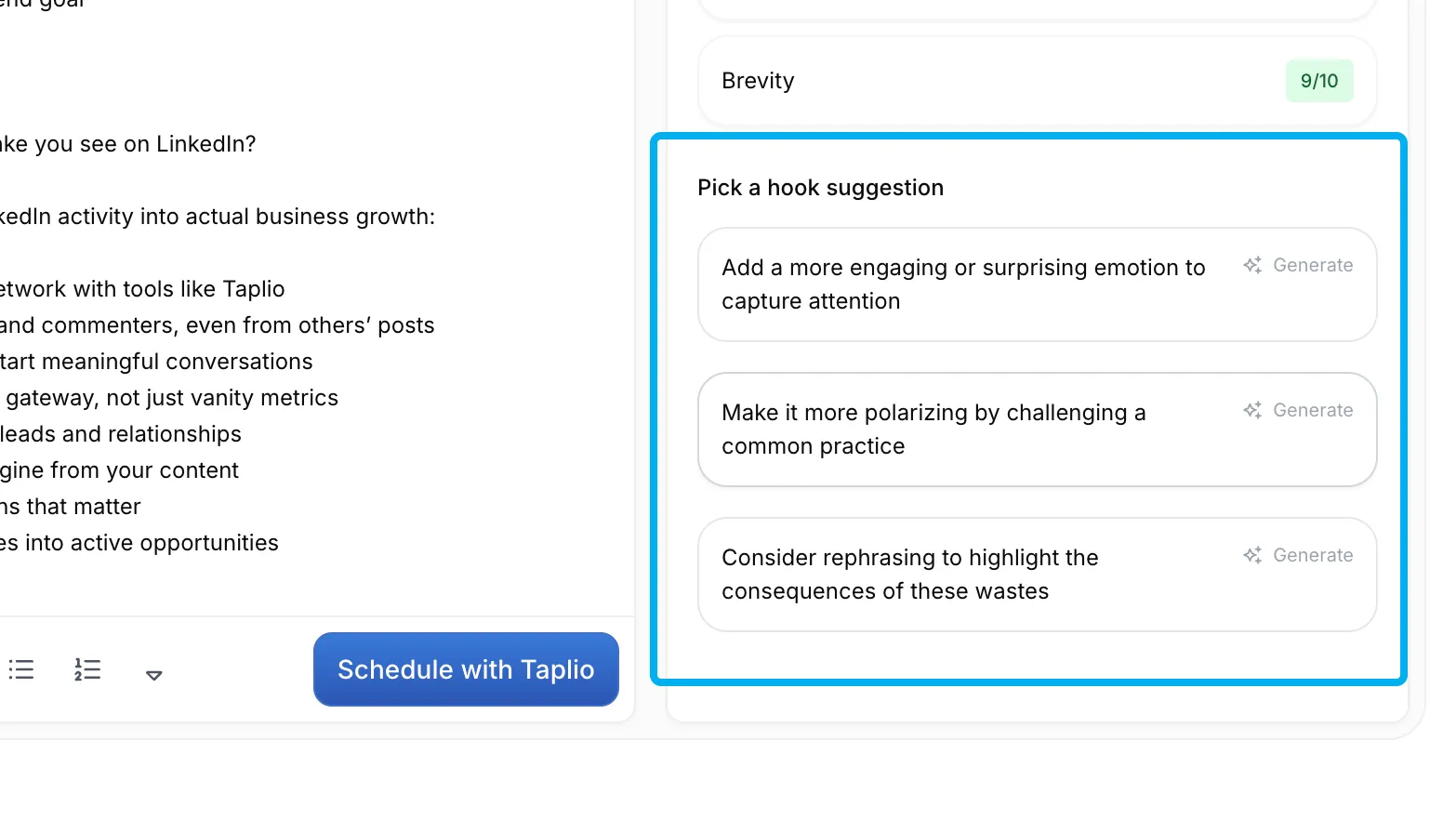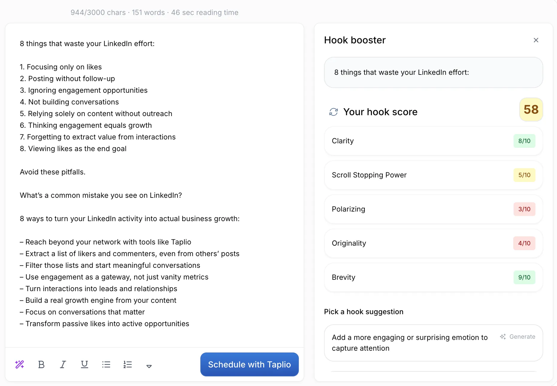 At Taplio, we’ve broken down the anatomy of a truly effective LinkedIn hook into five critical criteria. These are the very same principles that power the LinkedIn Hook Booster.