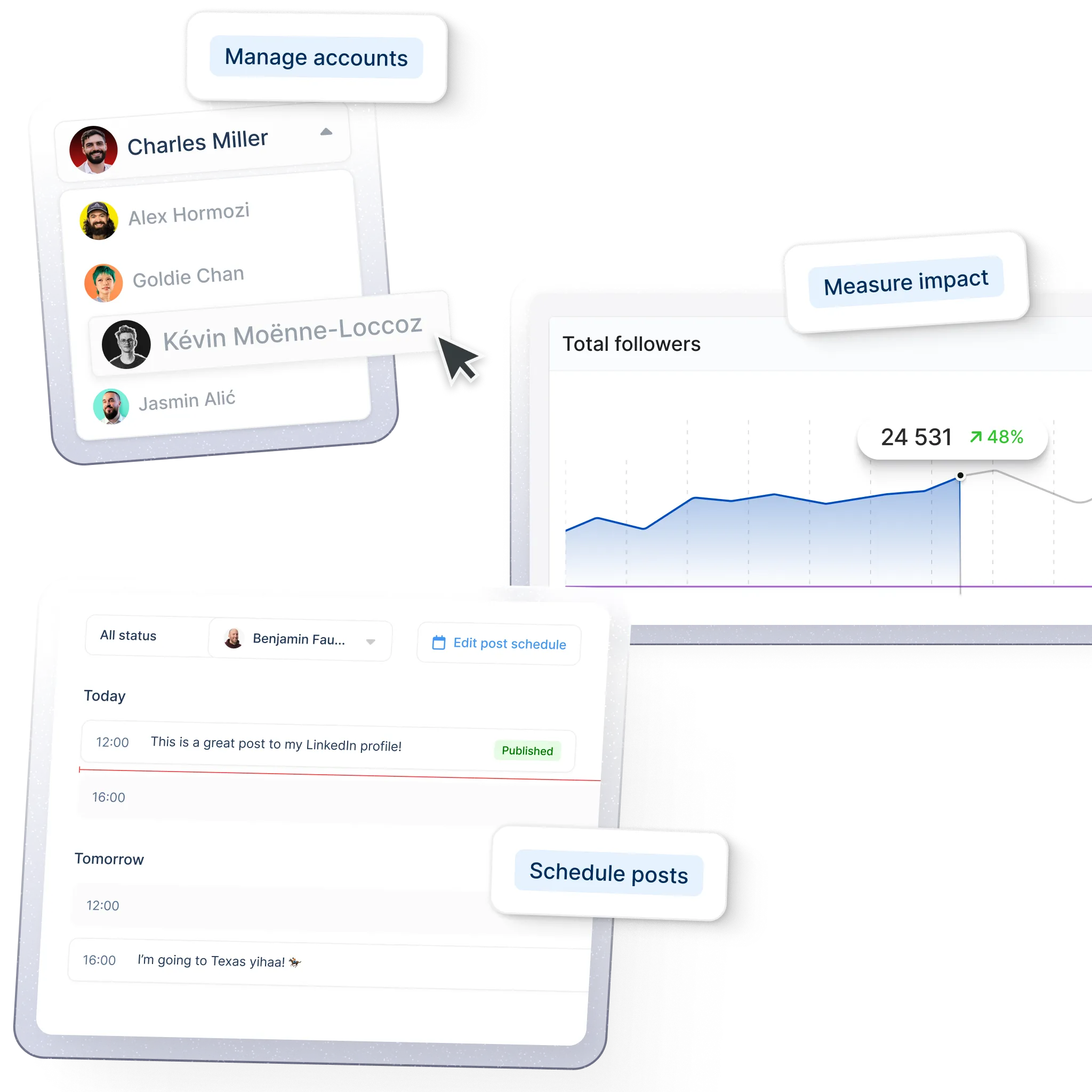 Manage multi-client calendars, support all LinkedIn post formats.