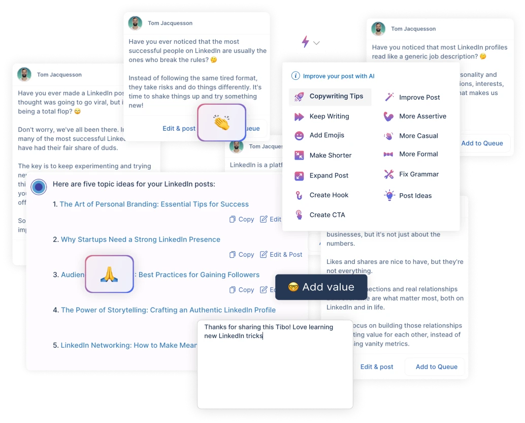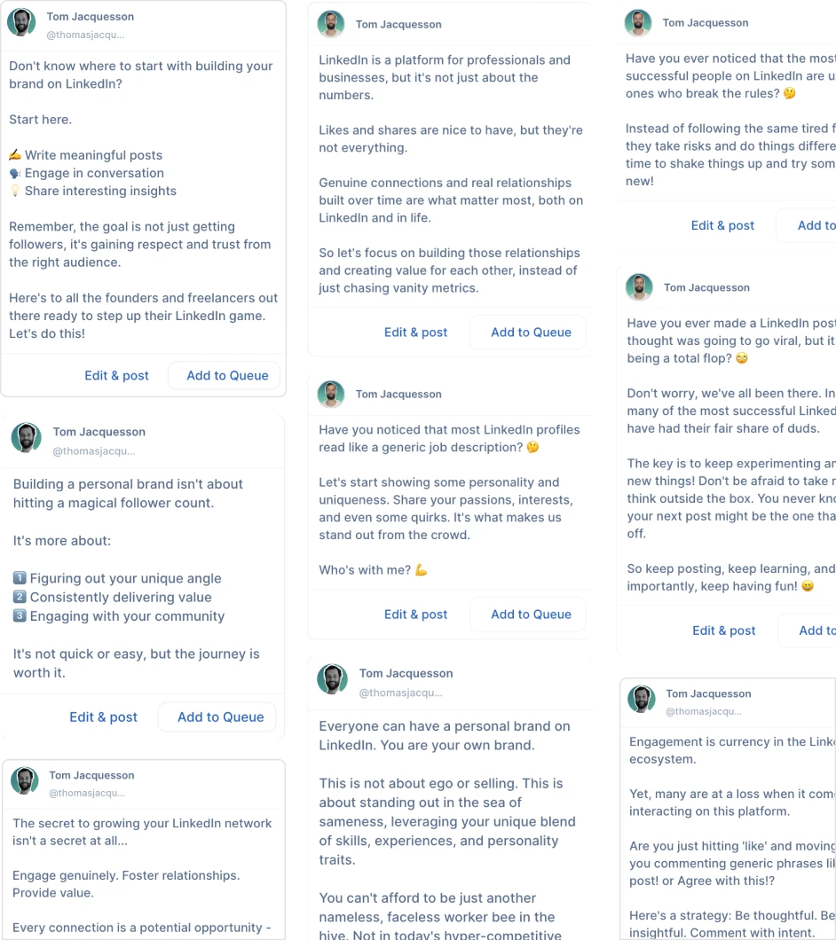 Our AI analyzes who you are and what you talk about to generate relevant, high-performing posts tailor-made for you. All from scratch.